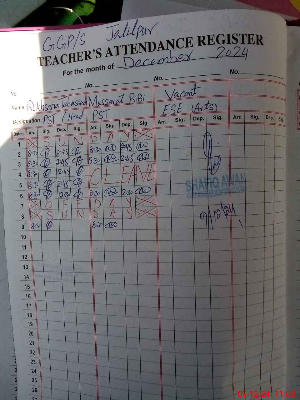 | Name: RU**** TA**** Designation: (School Headmaster's/Headmistress's) ESE(ARTS) Phone/Cell Number: 03**** |