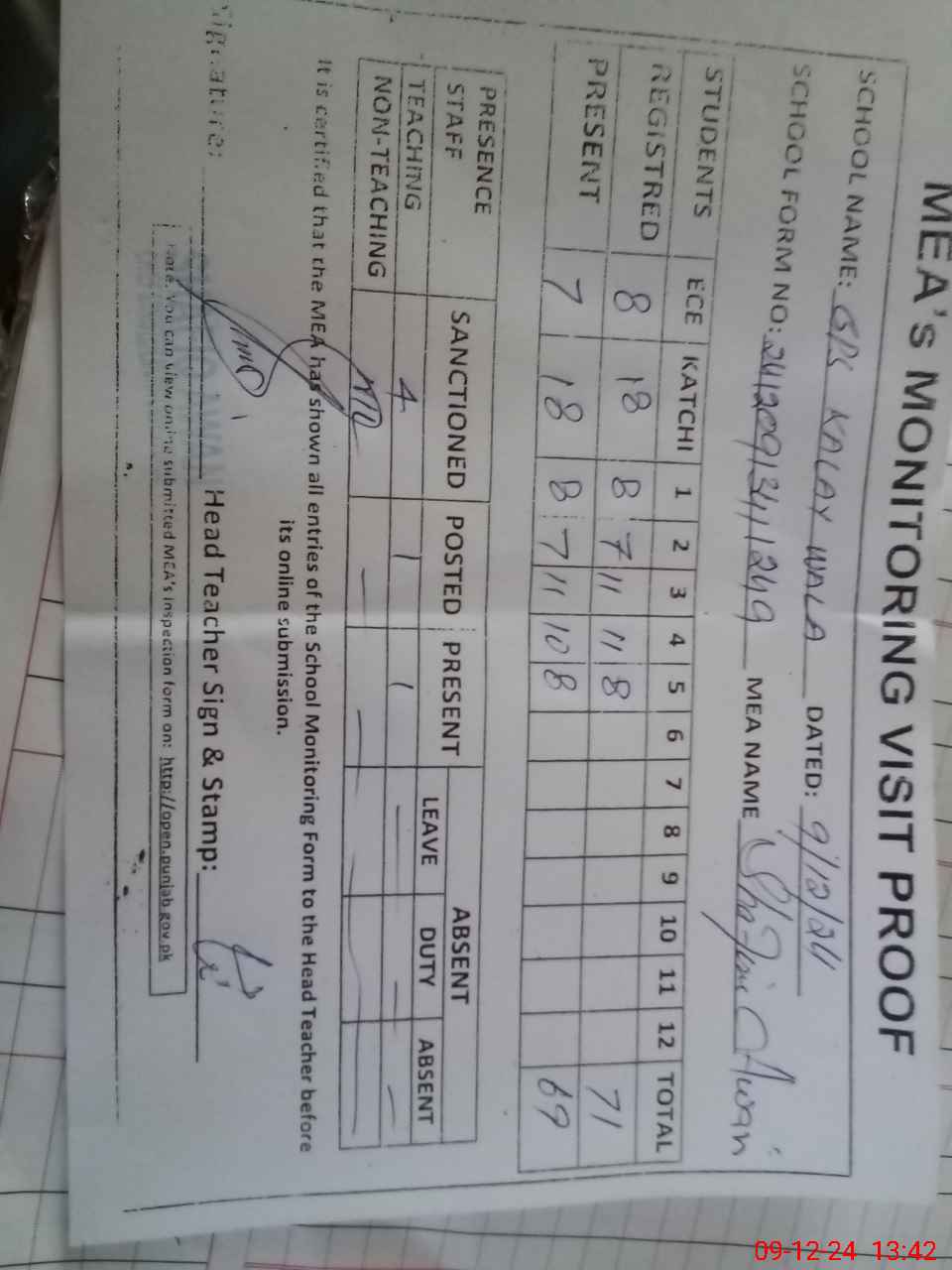 | Attendance Register | Head Teacher | MEA with School | Visit Proof |