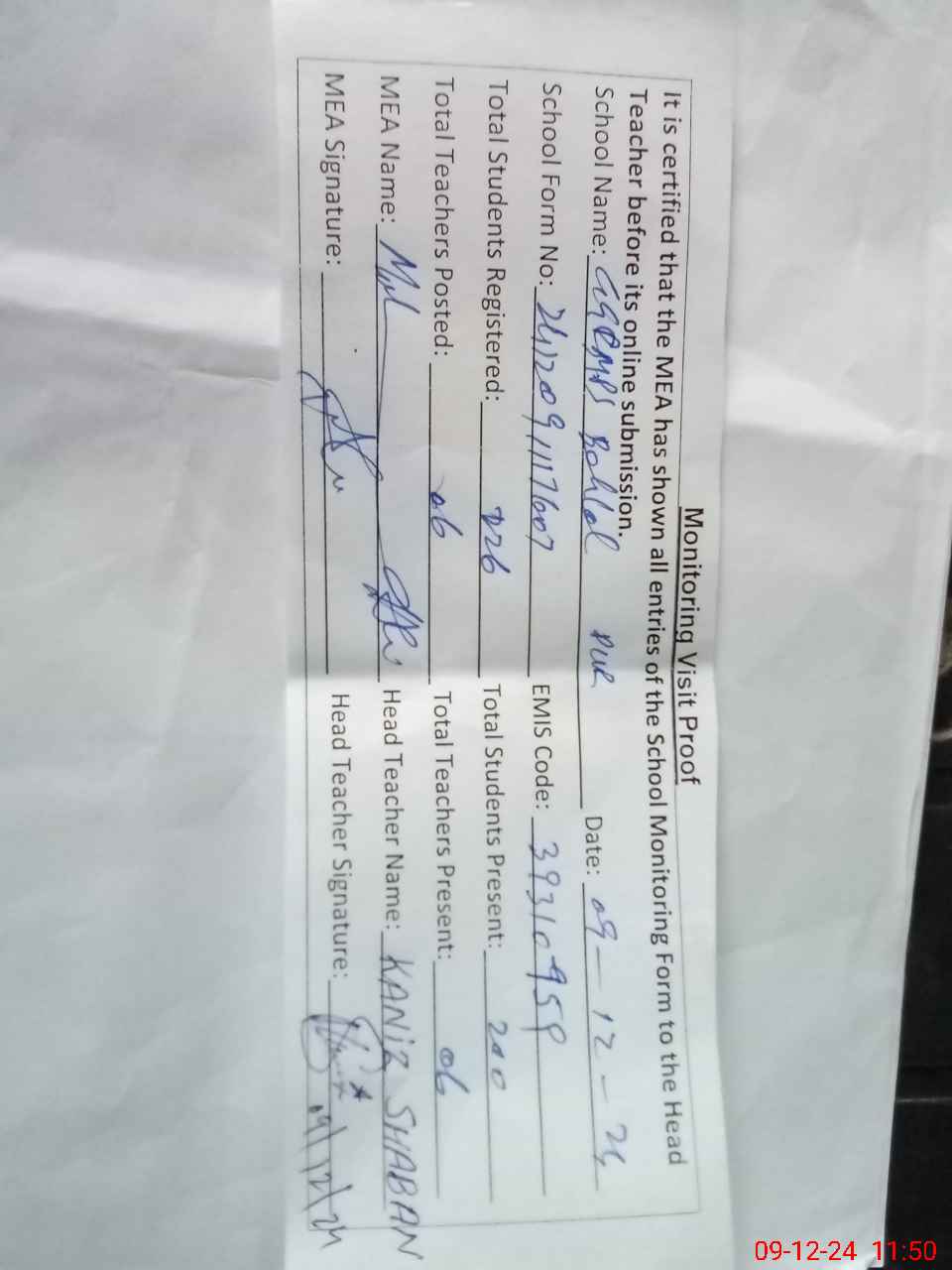 | Attendance Register | Head Teacher | MEA with School | Visit Proof |