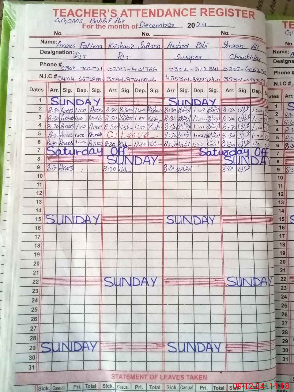 | CNIC | Full Name | Designation | R/C | Absence During Last Calender Month |