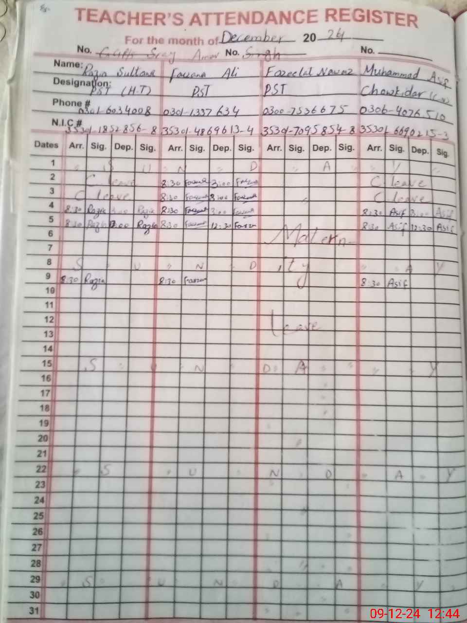 | CNIC | Full Name | Designation | R/C | Absence during last cal. month |