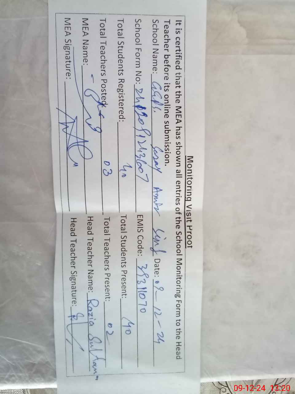| Attendance Register | Head Teacher | MEA with School | Visit Proof |