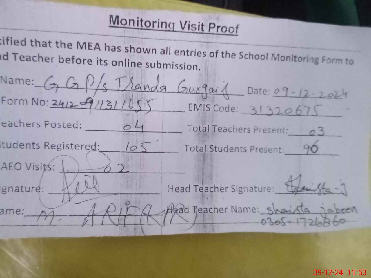 | EMIS Code: 31320675 | Name of School: GGPS TARNDA GOUR GAIJ | |||