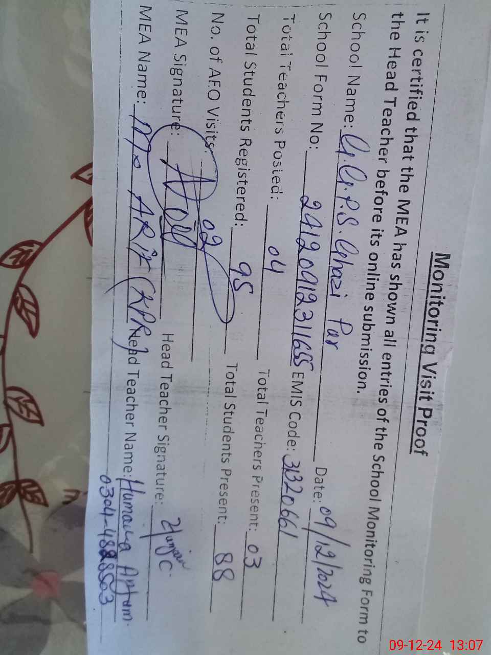 | Name: Hu**** An**** Designation: (School Headmaster's/Headmistress's) PST Phone/Cell Number: 03**** |