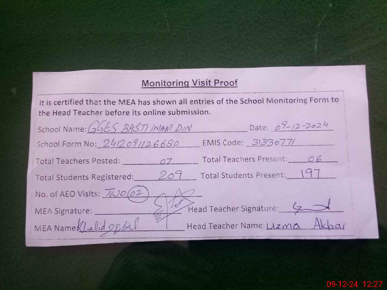 | Attendance Register | Head Teacher | MEA with School | Visit Proof |