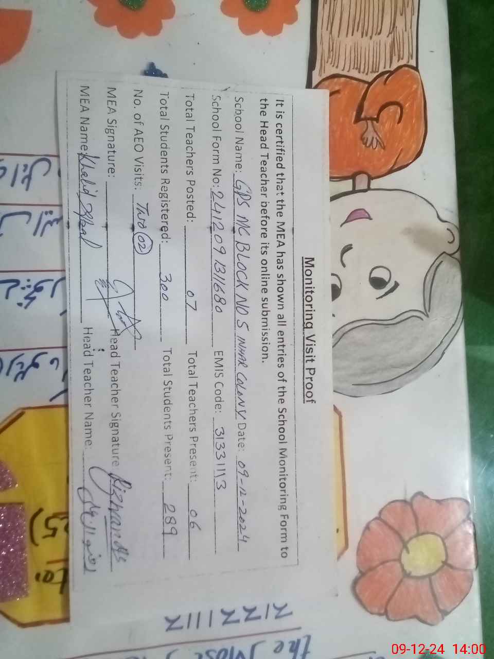 | Attendance Register | Head Teacher | MEA with School | Visit Proof |