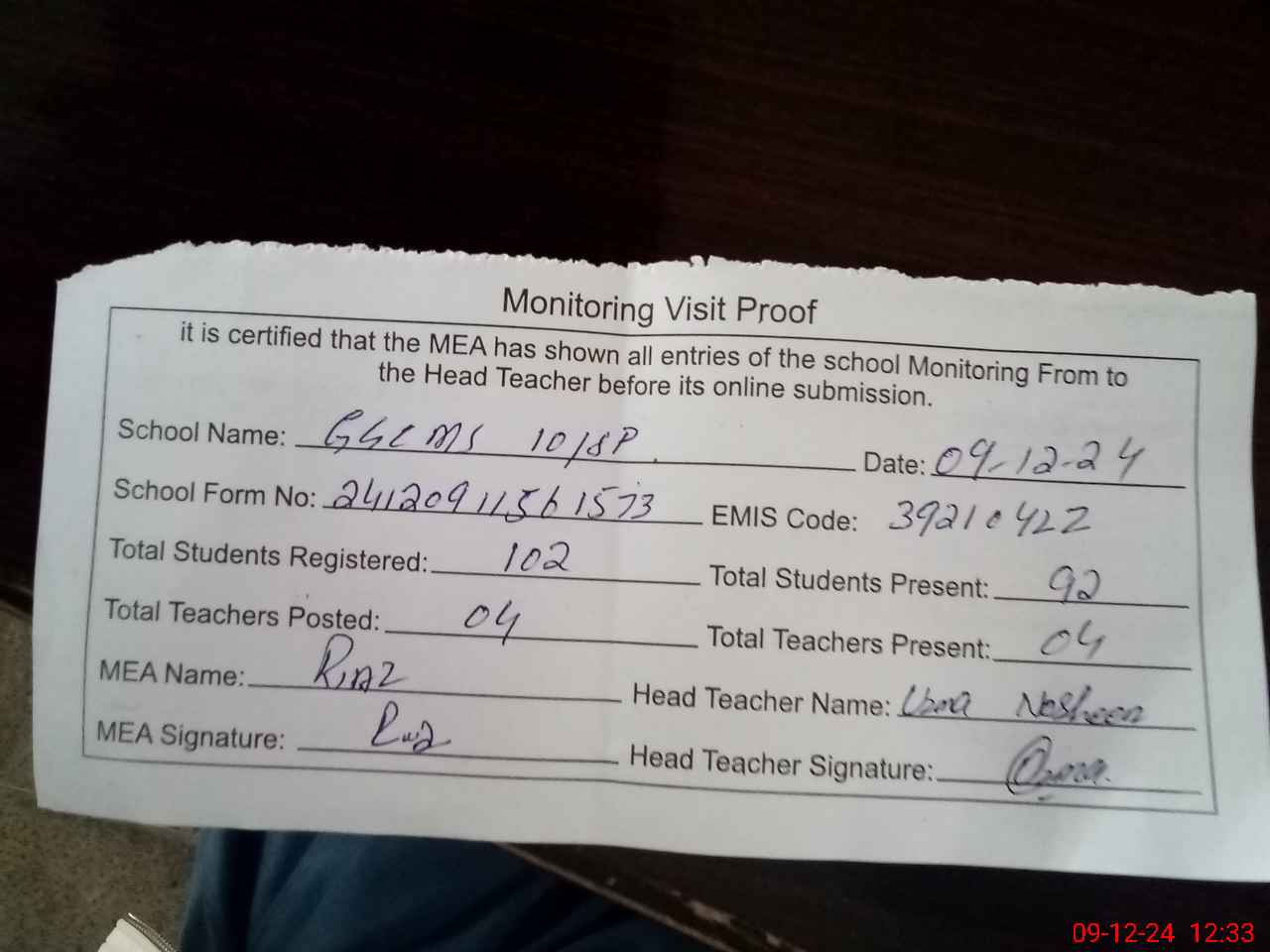 | Attendance Register | Head Teacher | MEA with School | Visit Proof |