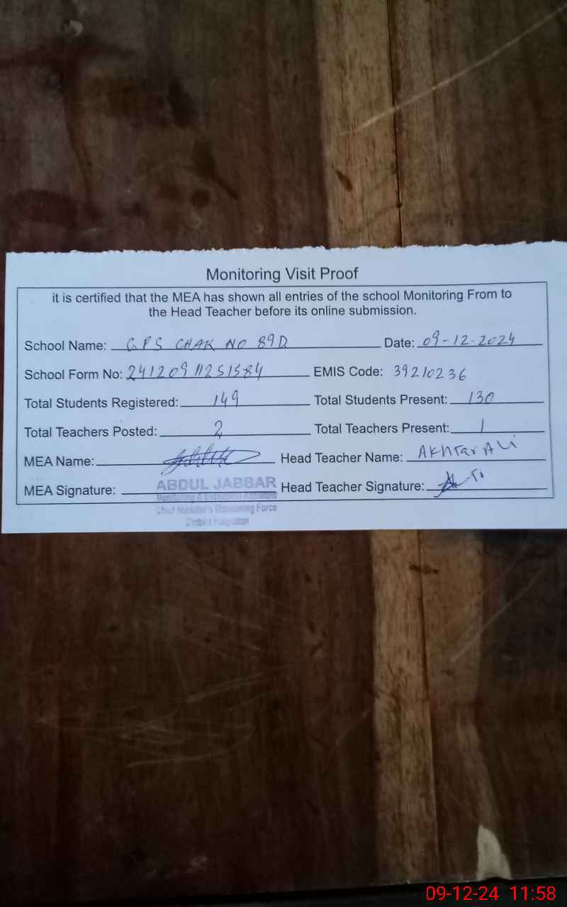 | EMIS Code: 39210236 | Name of School: GPS CHAK NO. 89 /D | |||