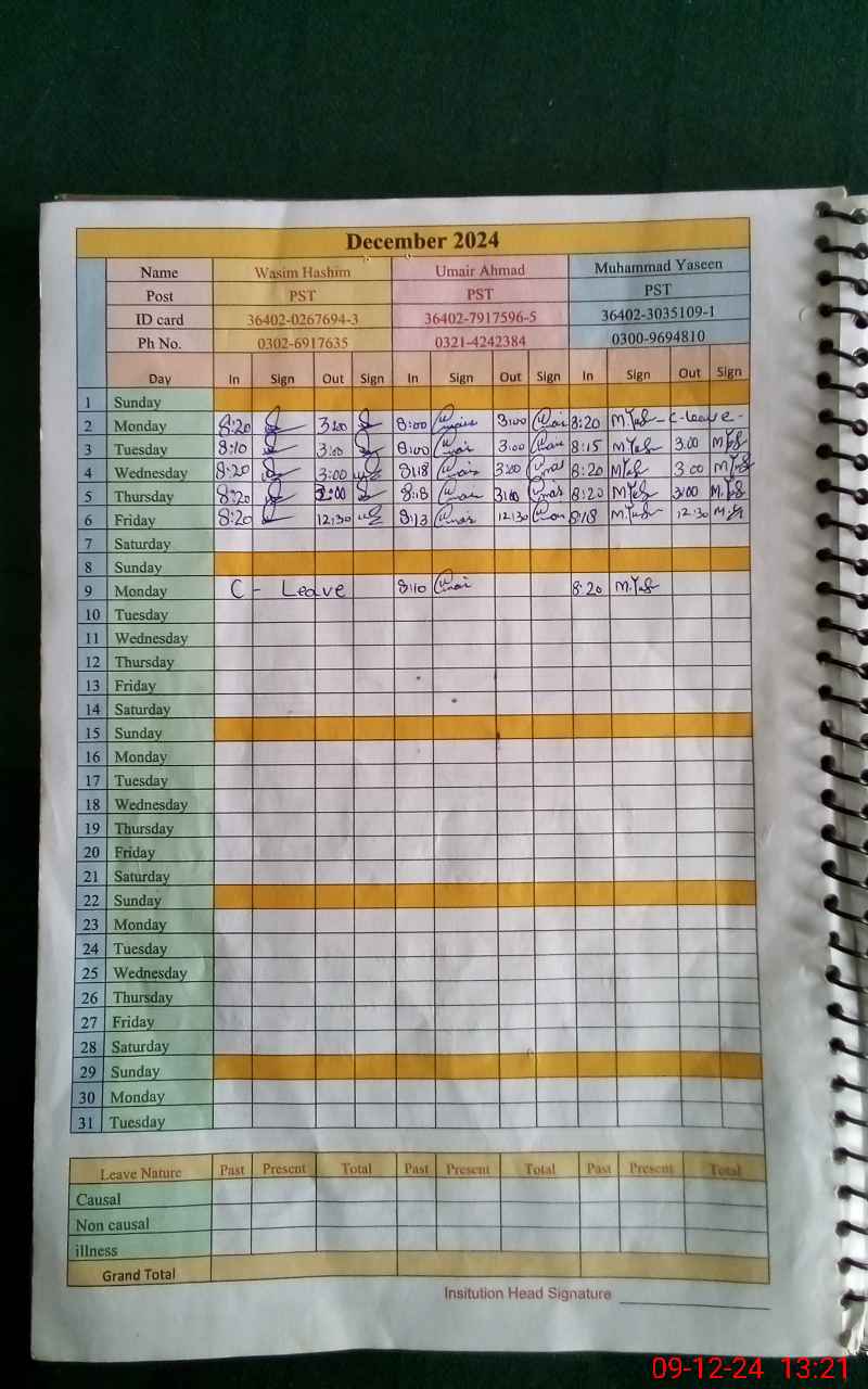 | CNIC | Full Name | Designation | R/C | Absence During Last Calender Month |