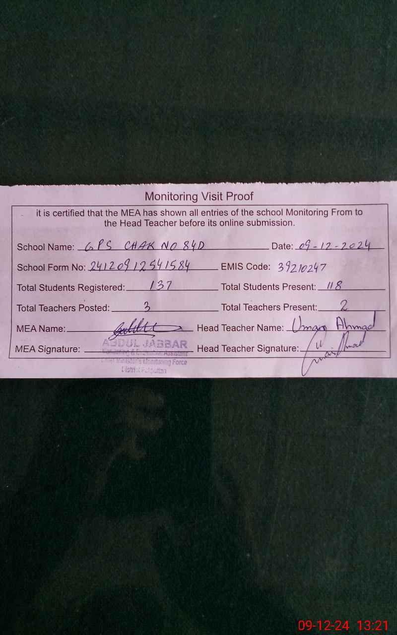 | EMIS Code: 39210247 | Name of School: GPS CHAK NO. 84 / D | |||