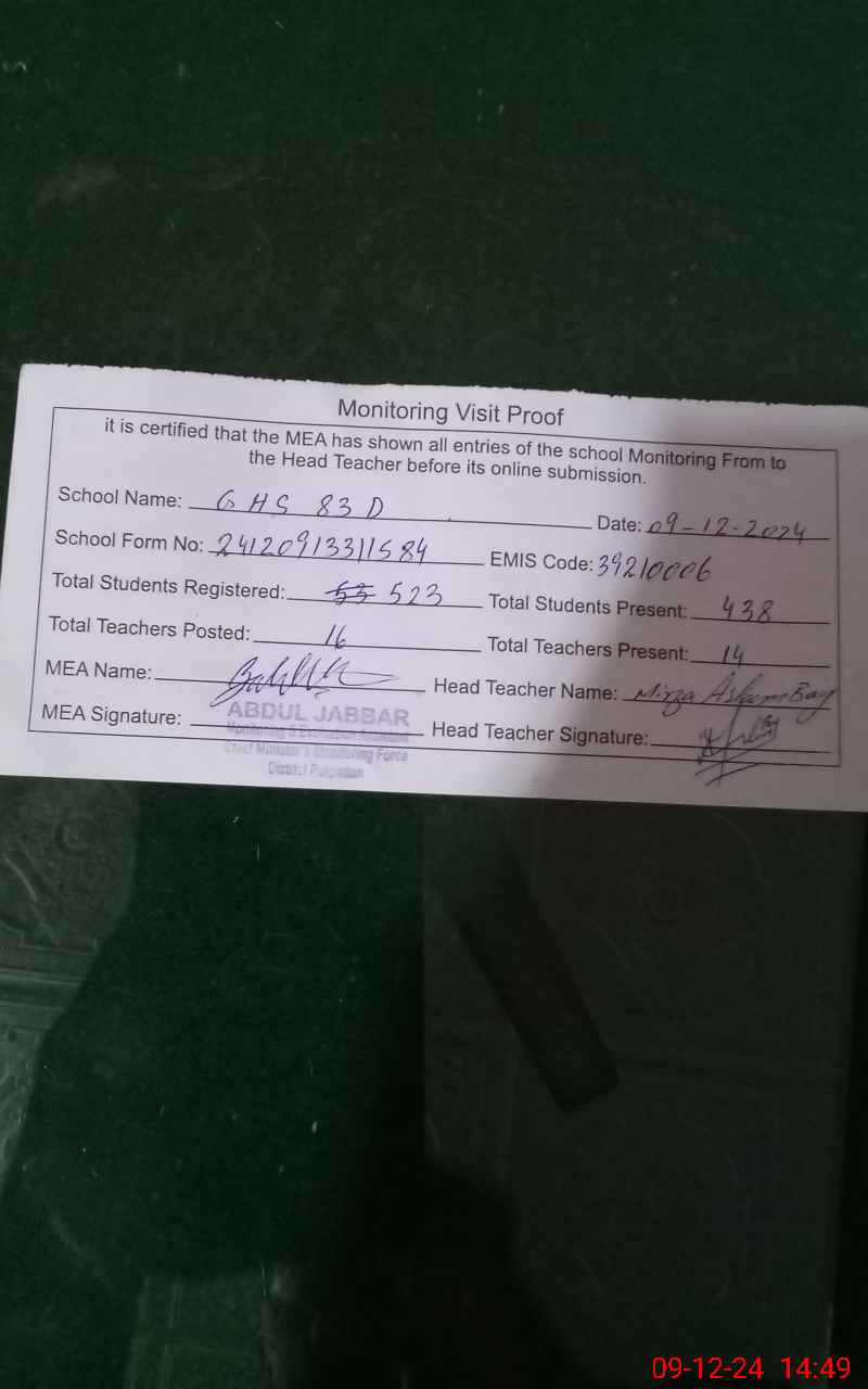 | EMIS Code: 39210006 | Name of School: GHS 83/D P.O 83/D PAKPATTAN | |||
