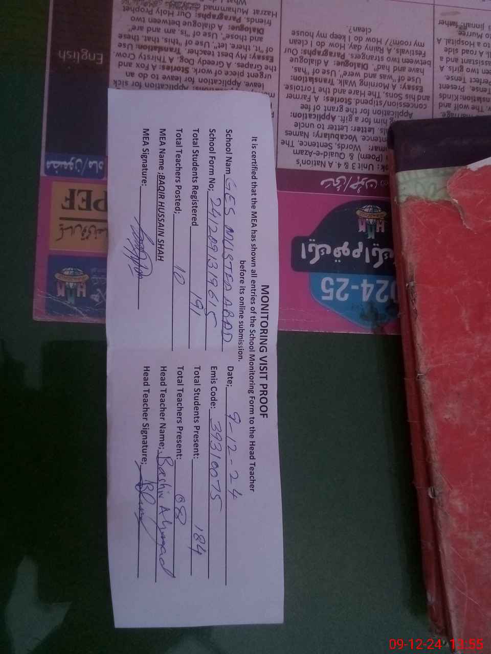 | Attendance Register | Head Teacher | MEA with School | Visit Proof |