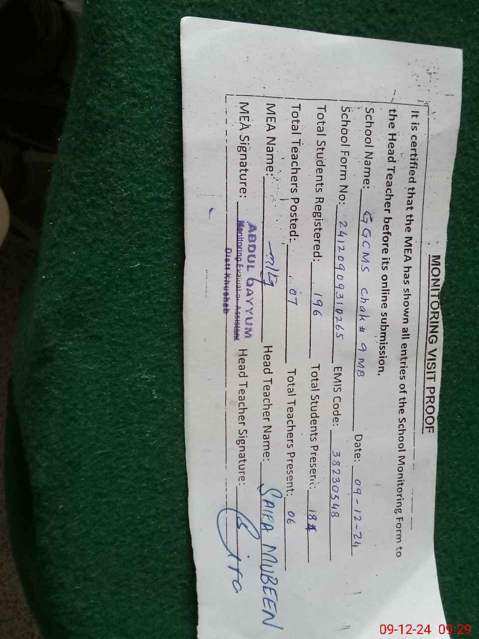 | EMIS Code: 38230548 | Name of School: GGCMS CHAK NO. 9 MB | |||