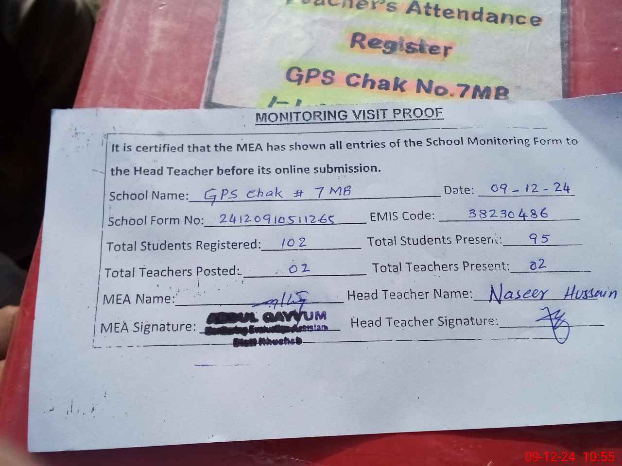 | EMIS Code: 38230486 | Name of School: GPS CHAK NO. 7 MB | |||