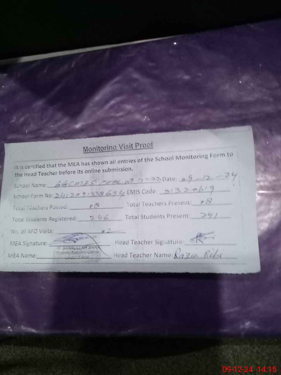 | Monitoring Date: 09-12-2024 | Start Time: 09-12-2024 01:38 PM | End Time: 09-12-2024 02:15 PM | Name of MEA: Mu**** Sa**** Ul**** Sa**** | |