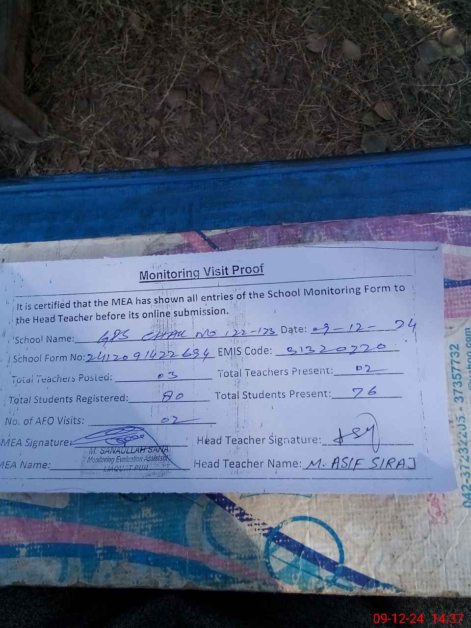 | EMIS Code: 31320220 | Name of School: GPS CHAK 122-123 NP | |||