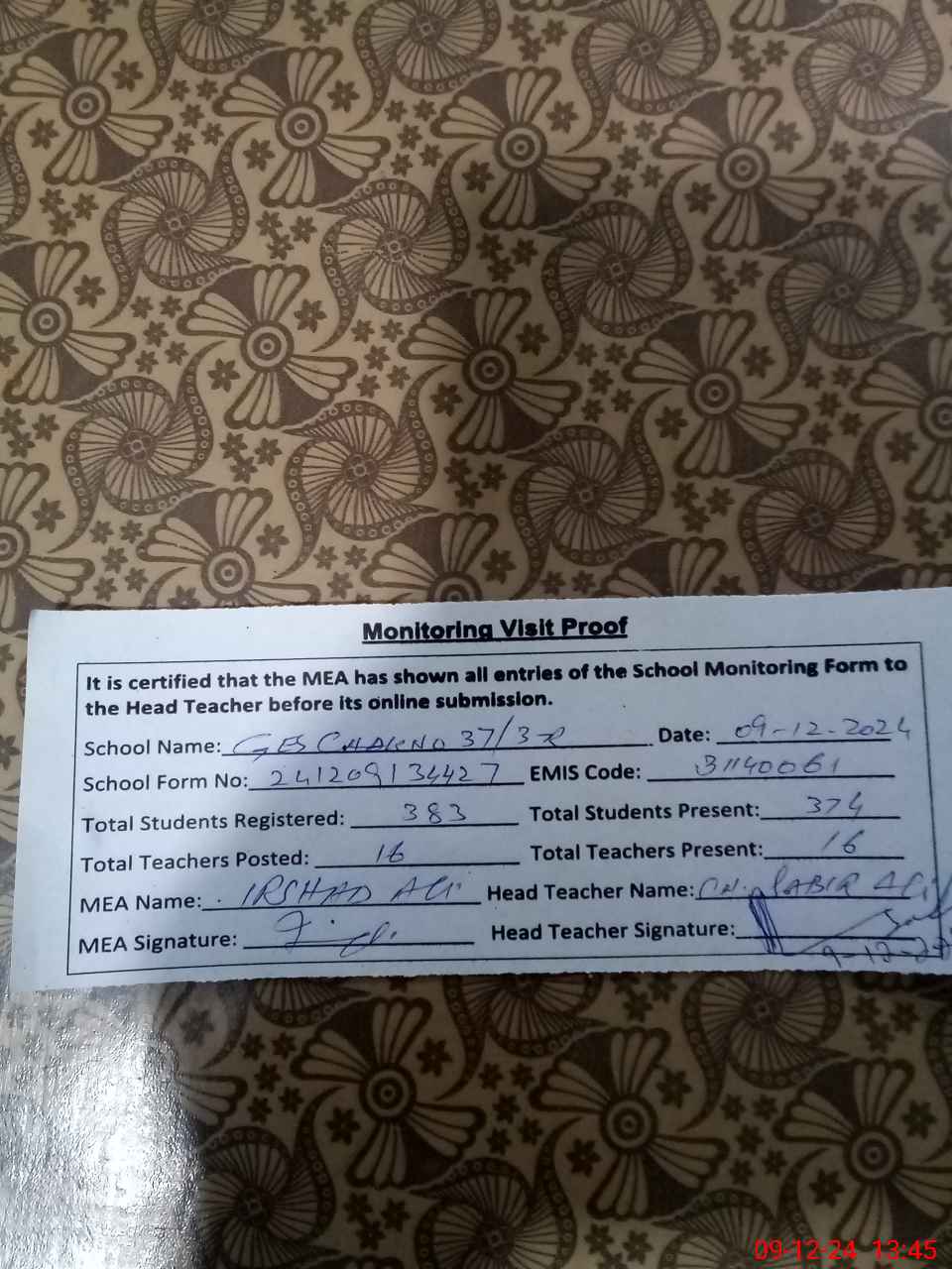 | EMIS Code: 31140061 | Name of School: GES CHAK NO. 37/3-R | |||