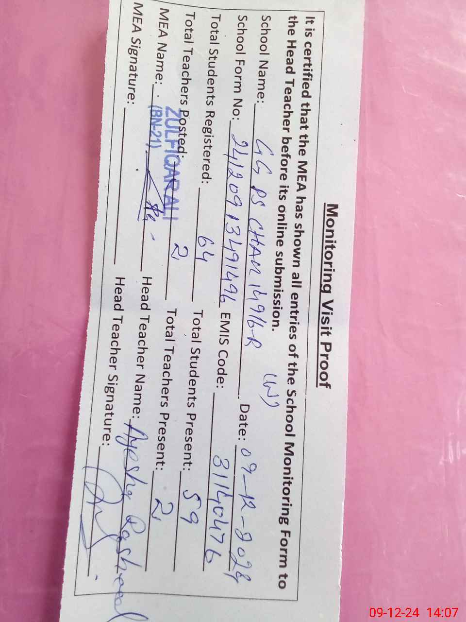 | Attendance Register | Head Teacher | MEA with School | Visit Proof |