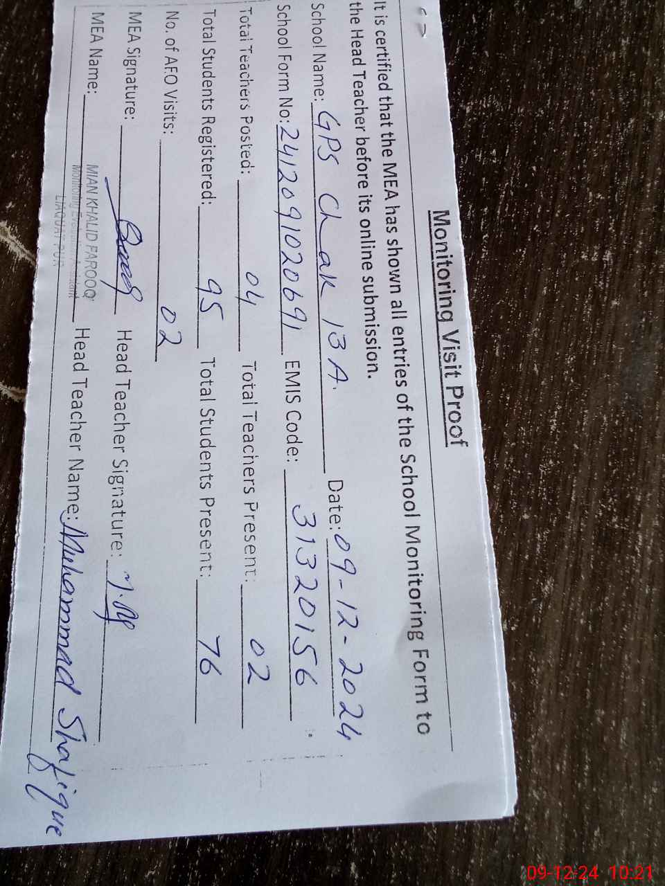 | Attendance Register | Head Teacher | MEA with School | Visit Proof |