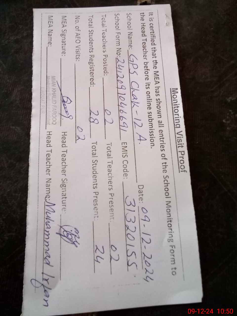 | EMIS Code: 31320155 | Name of School: GPS CHAK 12/A | |||