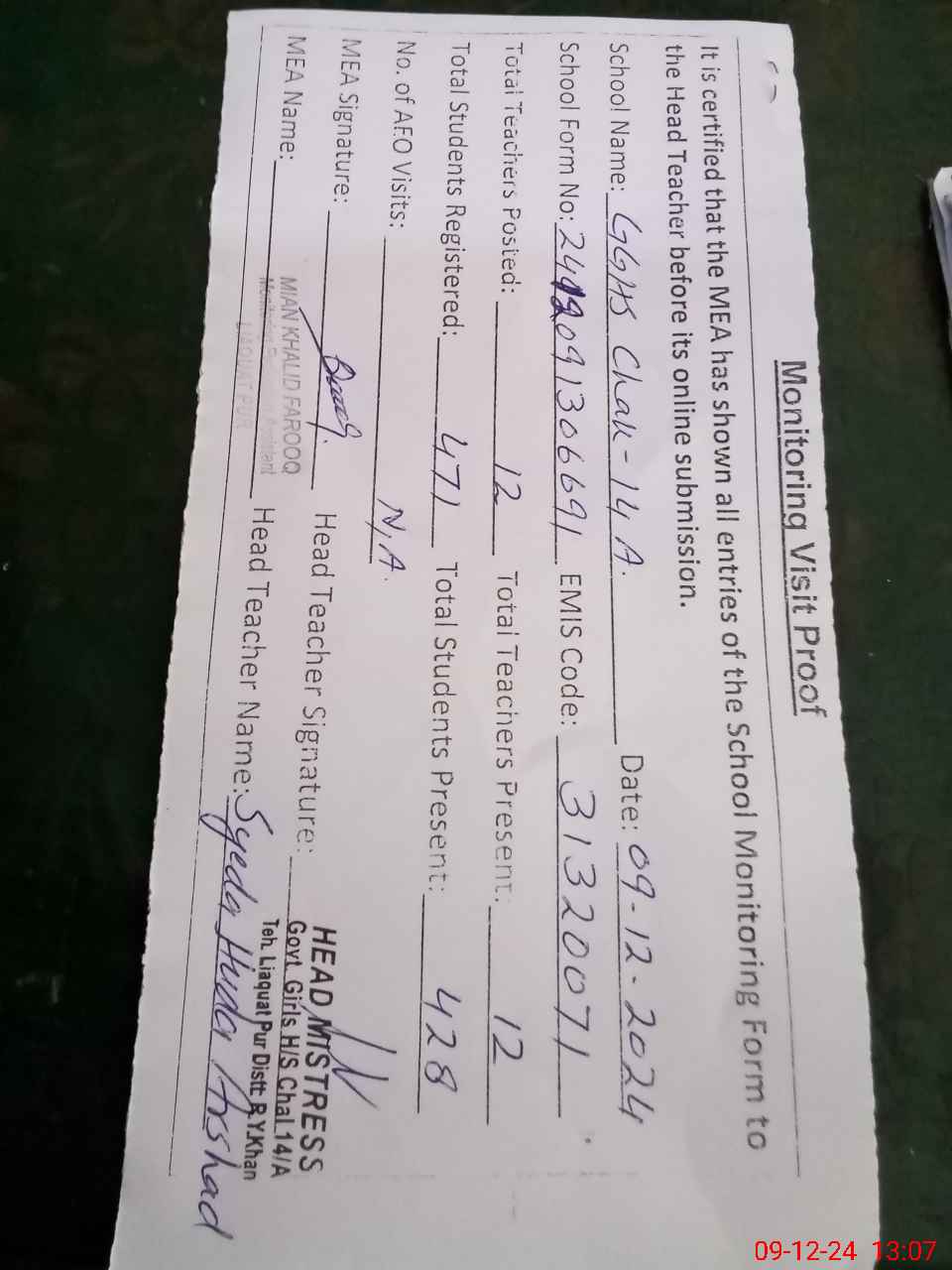 | EMIS Code: 31320071 | Name of School: GGHS CHAK NO. 14/A | |||