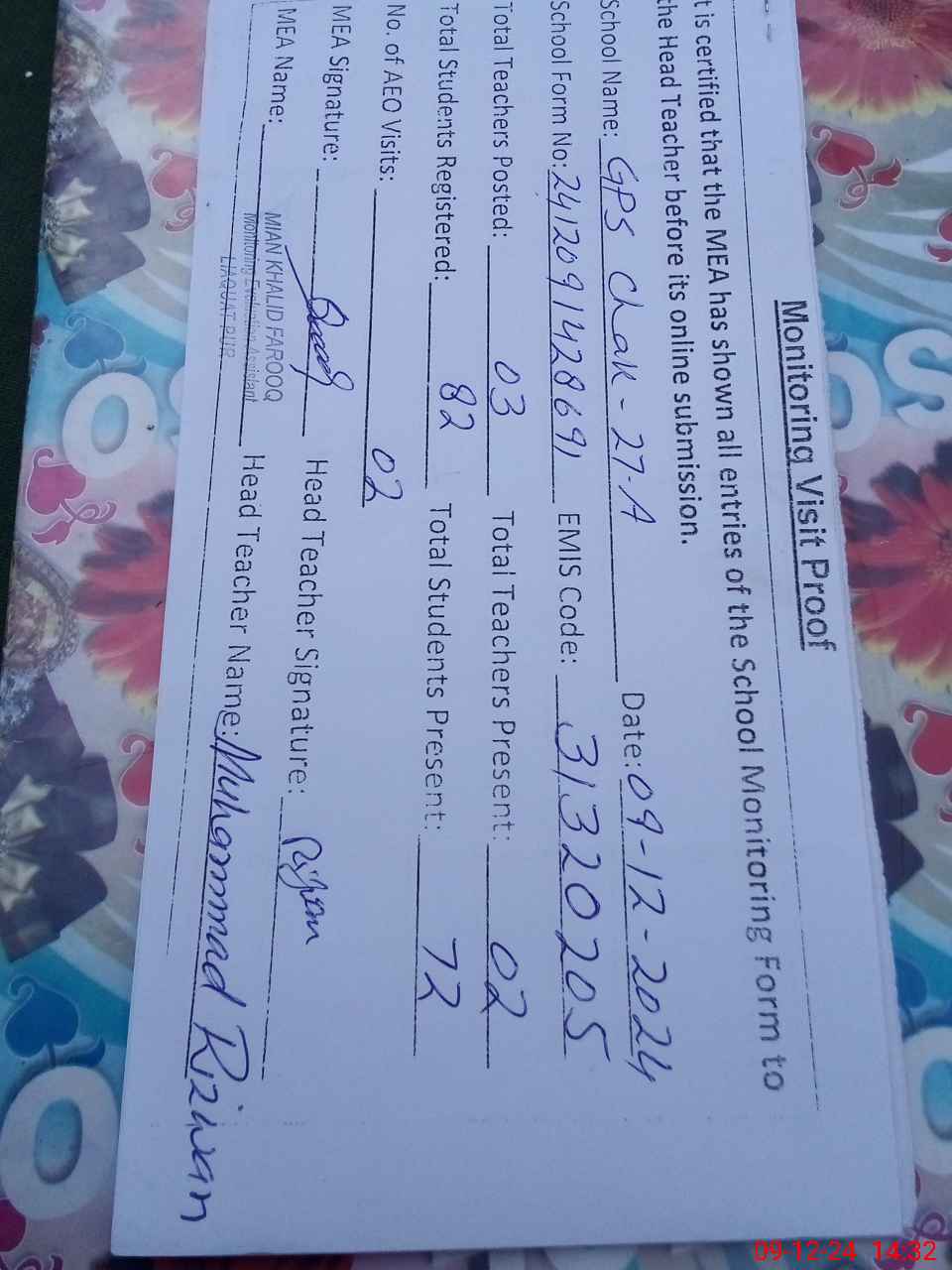 | Attendance Register | Head Teacher | MEA with School | Visit Proof |