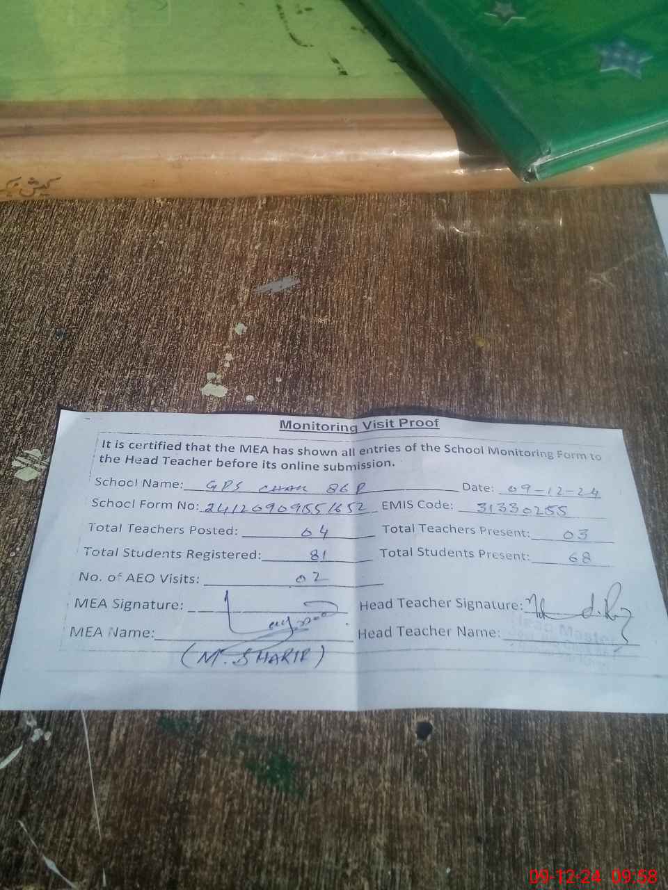 | Attendance Register | Head Teacher | MEA with School | Visit Proof |