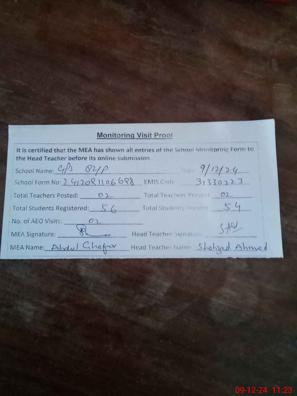 | Attendance Register | Head Teacher | MEA with School | Visit Proof |