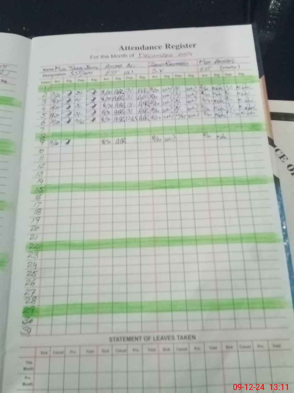 | CNIC | Full Name | Designation | R/C | Absence During Last Calender Month |
