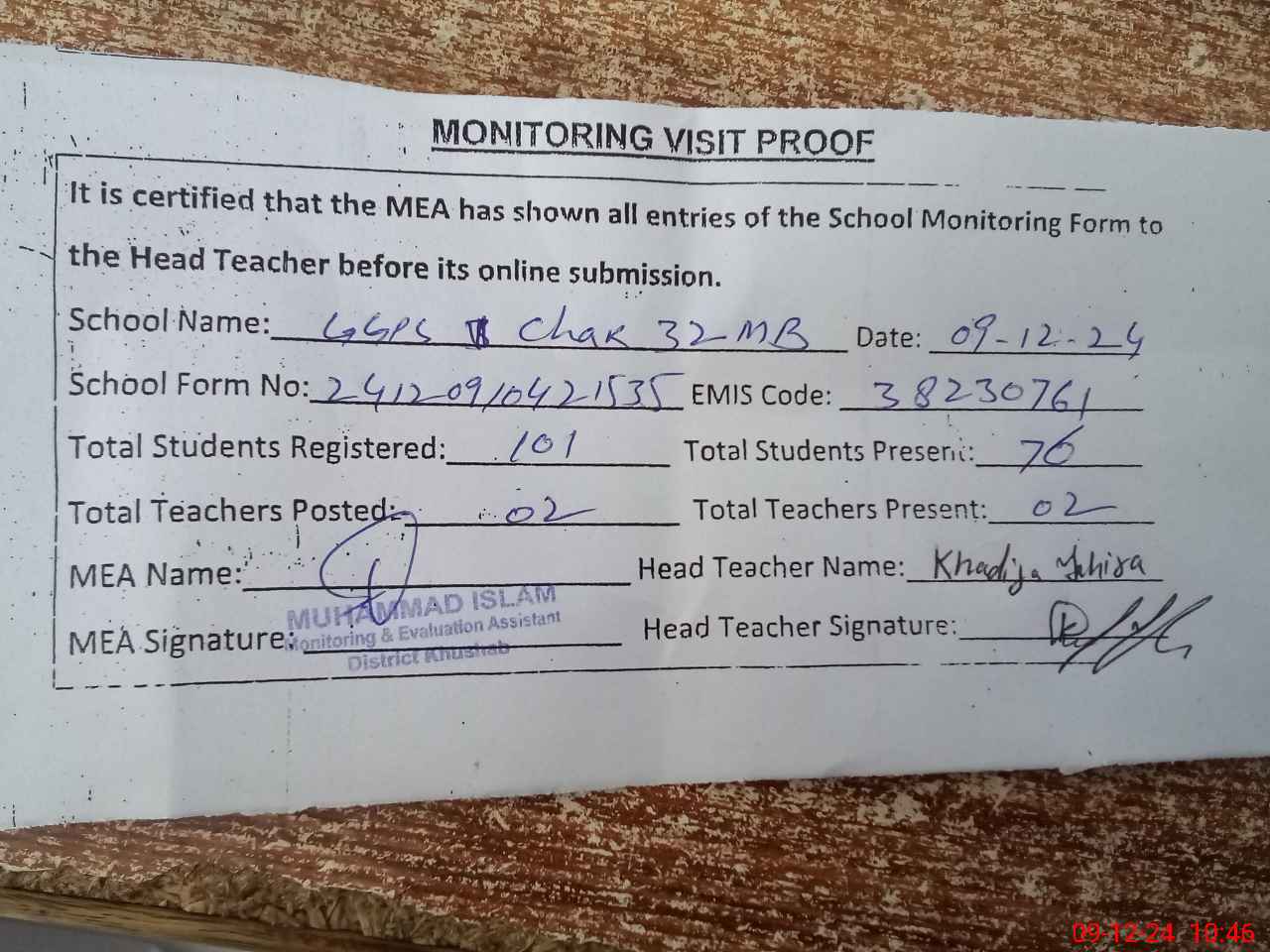 | Certified that this School was Inspected by the Undersigned MEA/DMO Today and the Information Stated Above is as Per Record. | |||||