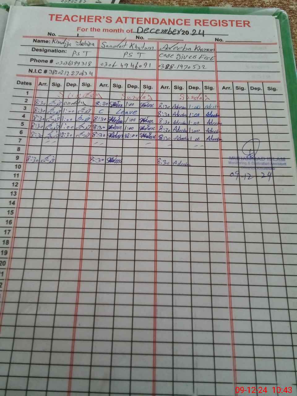 | CNIC | Full Name | Designation | R/C | Absence during last cal. month |