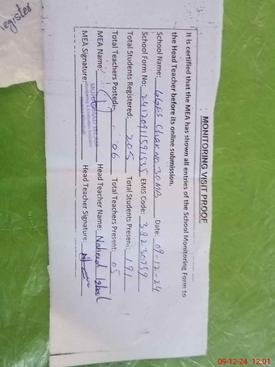 | Attendance Register | Head Teacher | MEA with School | Visit Proof |