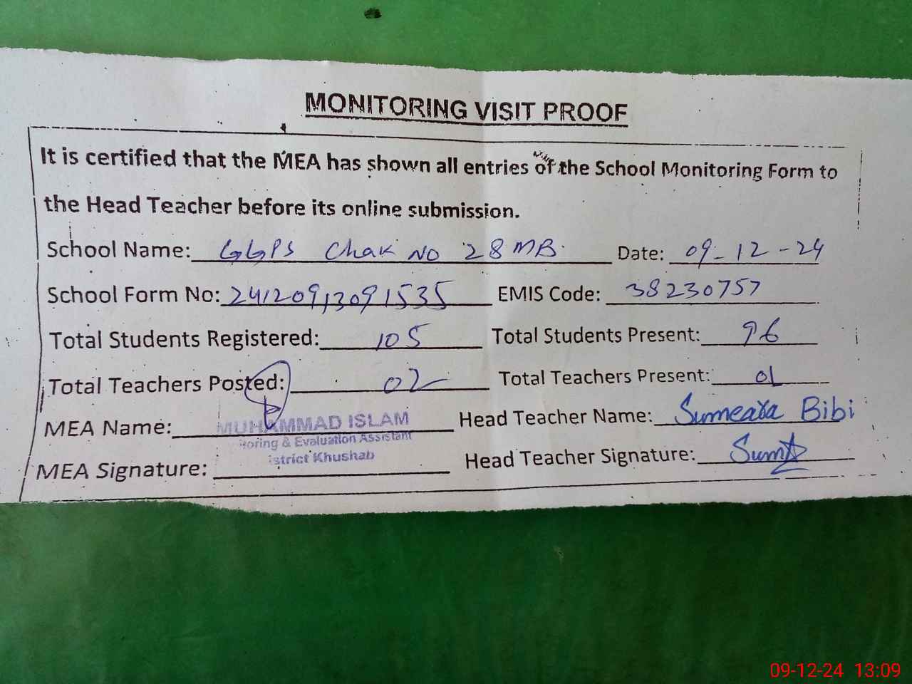 | EMIS Code: 38230757 | Name of School: GGPS CHAK NO 28 MB | |||