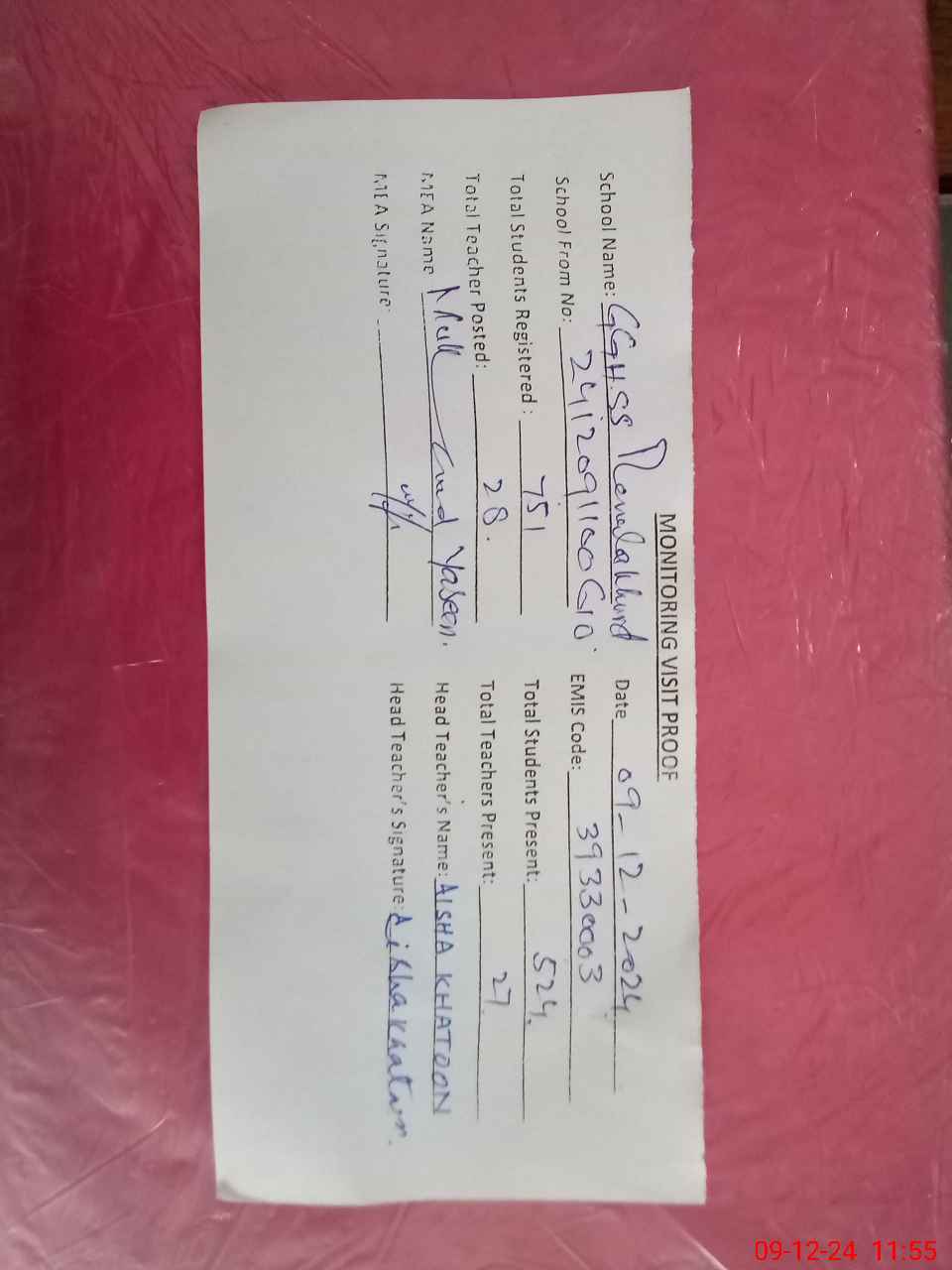 | Attendance Register | Head Teacher | MEA with School | Visit Proof |