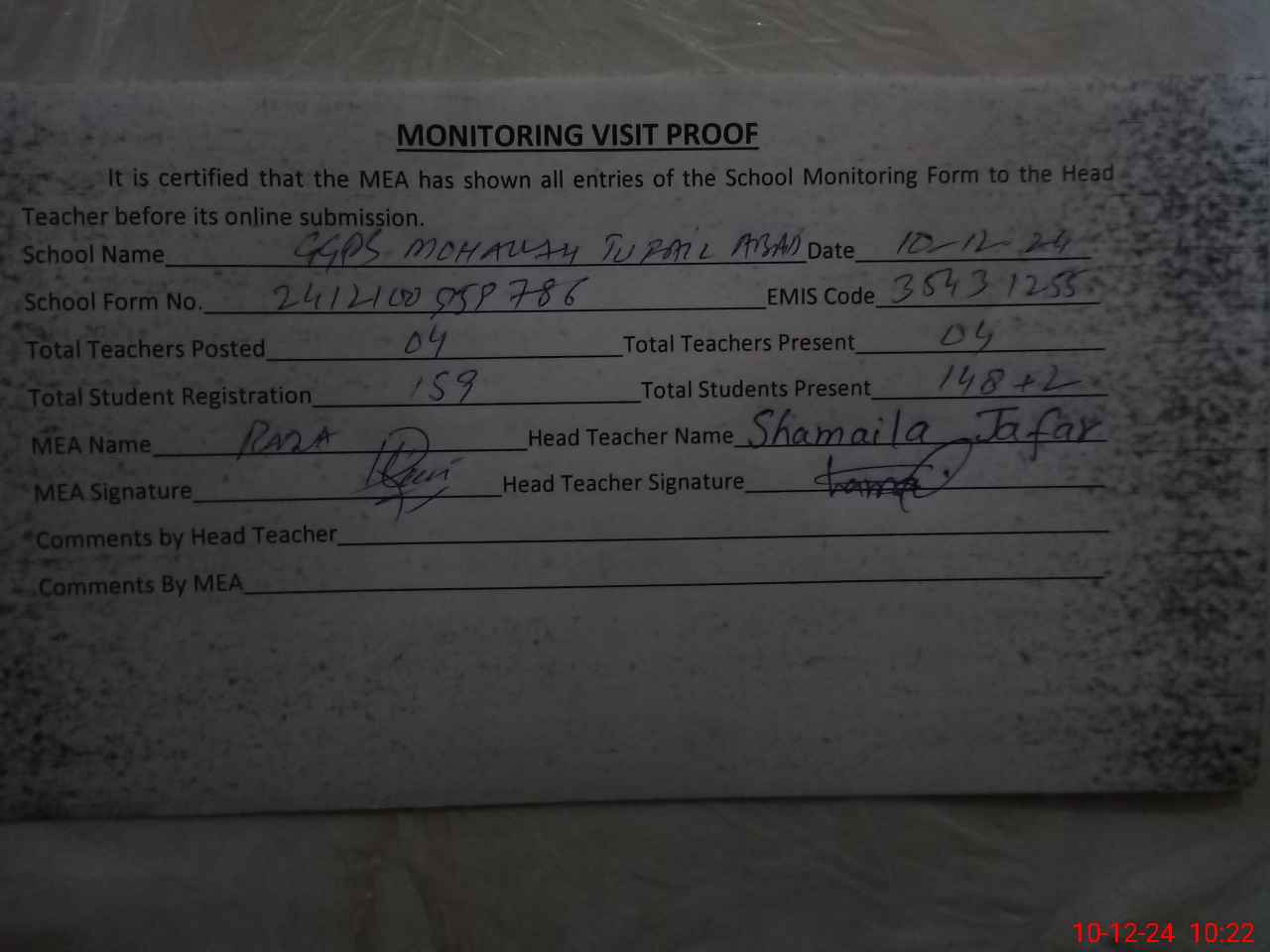 | Monitoring Date: 10-12-2024 | Start Time: 10-12-2024 09:15 AM | End Time: 10-12-2024 10:37 AM | Name of MEA: Ra**** Hu**** Gi**** | |