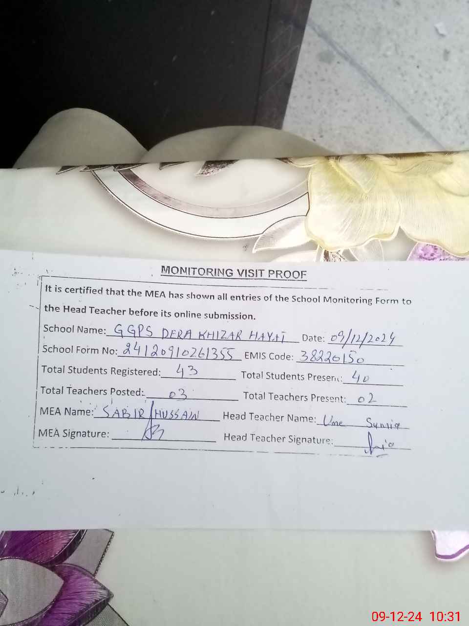 | EMIS Code: 38220150 | Name of School: GGPS DERA KHIZAR HAYAT | |||