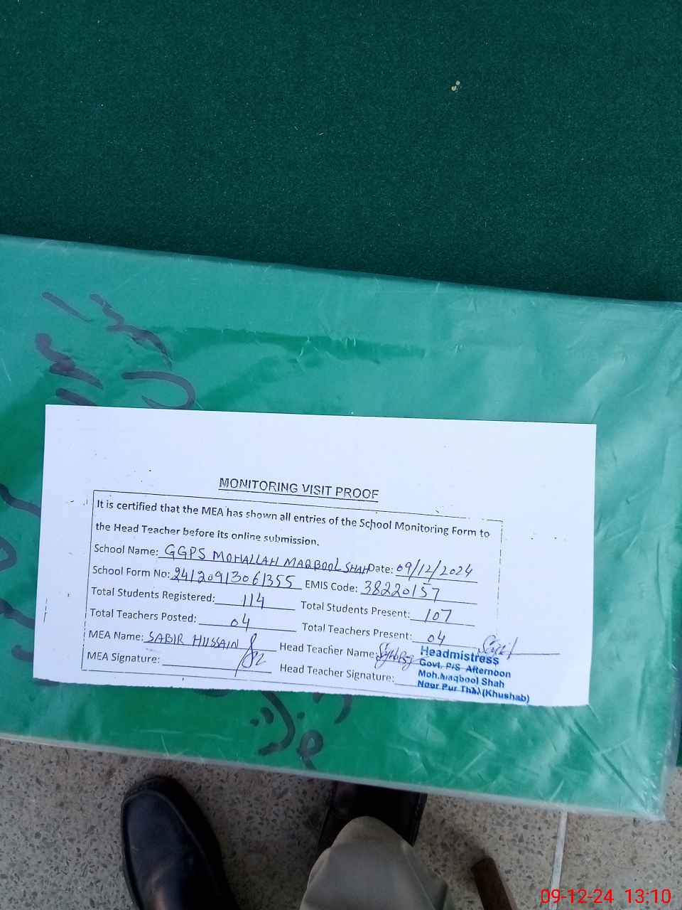 | Attendance Register | Head Teacher | MEA with School | Visit Proof |