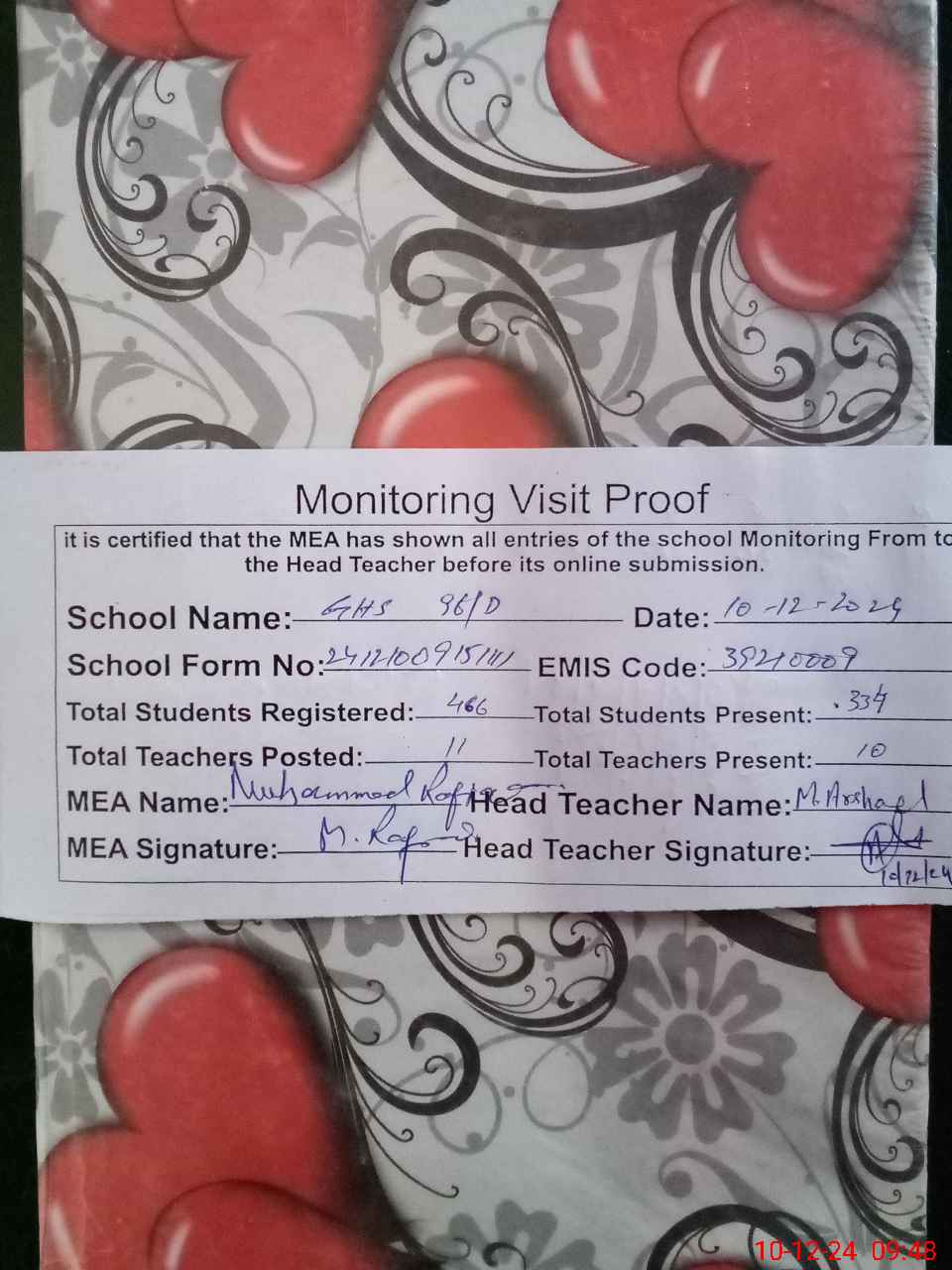 | Attendance Register | Head Teacher | MEA with School | Visit Proof |
