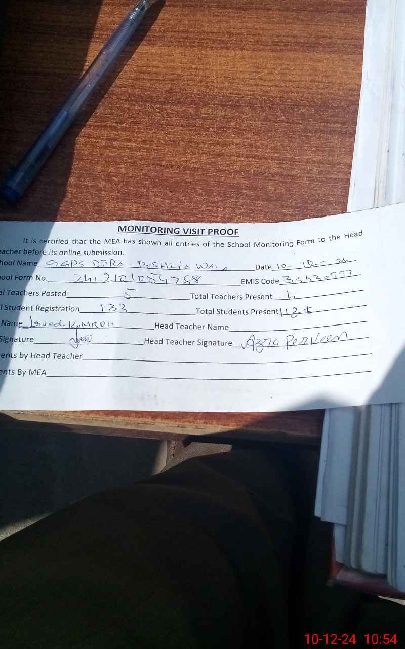 | Attendance Register | Head Teacher | MEA with School | Visit Proof |
