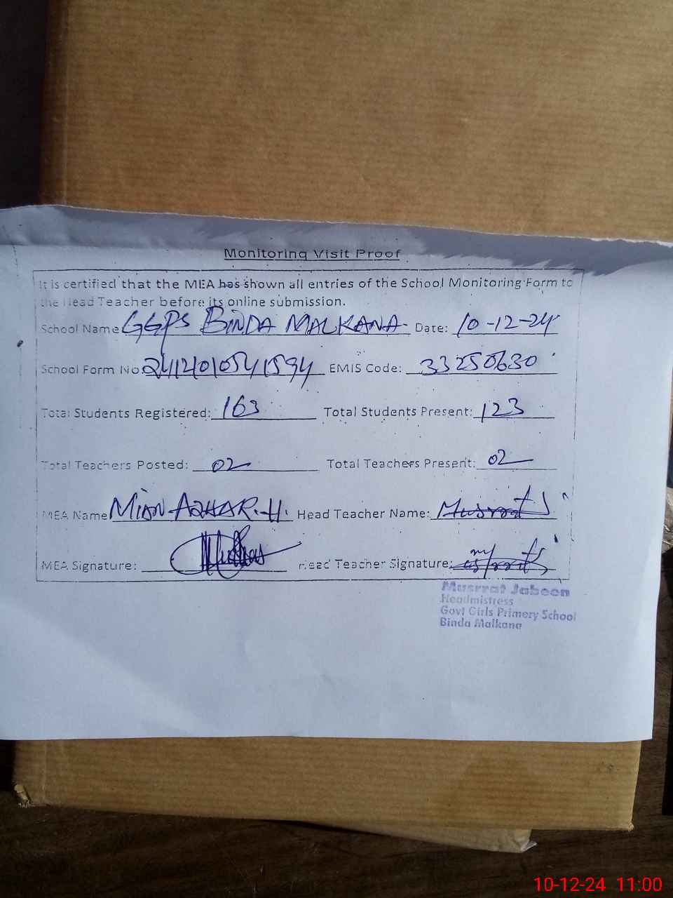 | Attendance Register | Head Teacher | MEA with School | Visit Proof |
