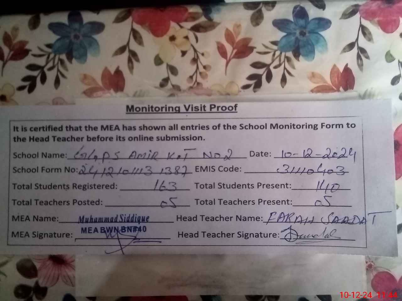 | EMIS Code: 31110403 | Name of School: GGPS AMIR KOT NO. 2 | |||