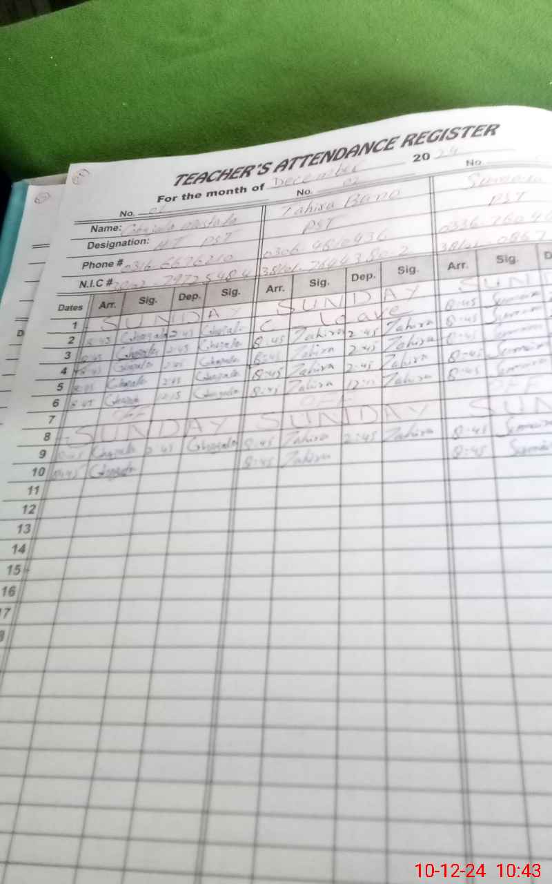 | CNIC | Full Name | Designation | R/C | Absence During Last Calender Month |