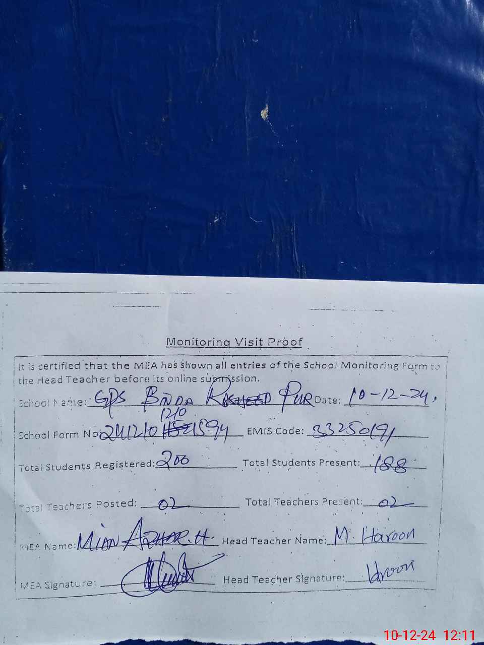 | Attendance Register | Head Teacher | MEA with School | Visit Proof |