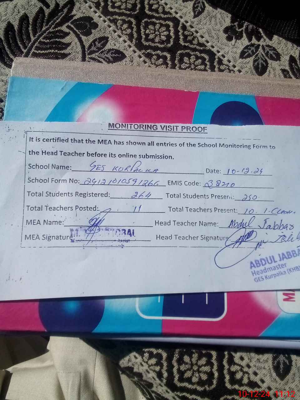 | Attendance Register | Head Teacher | MEA with School | Visit Proof |