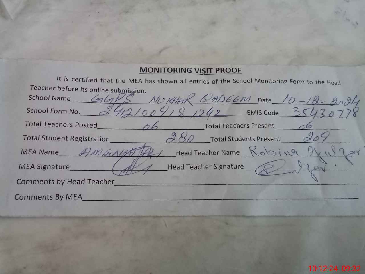| Monitoring Date: 10-12-2024 | Start Time: 10-12-2024 09:09 AM | End Time: 10-12-2024 09:44 AM | Name of MEA: Am**** Al**** | |