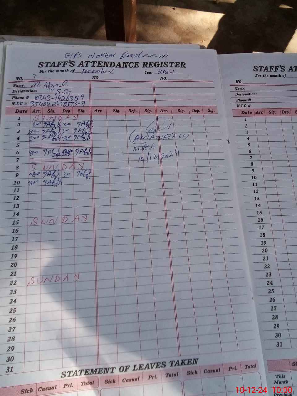 | Name: IR**** AH**** Designation: (School Headmaster's/Headmistress's) PST Phone/Cell Number: 03**** |