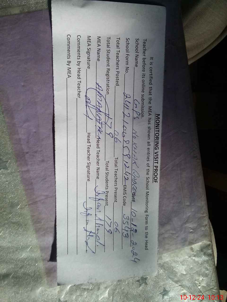 | Attendance Register | Head Teacher | MEA with School | Visit Proof |