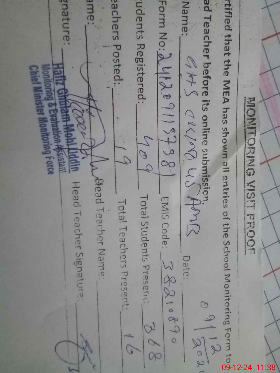 | EMIS Code: 38210890 | Name of School: GHS CHAK NO. 45 AMB | |||