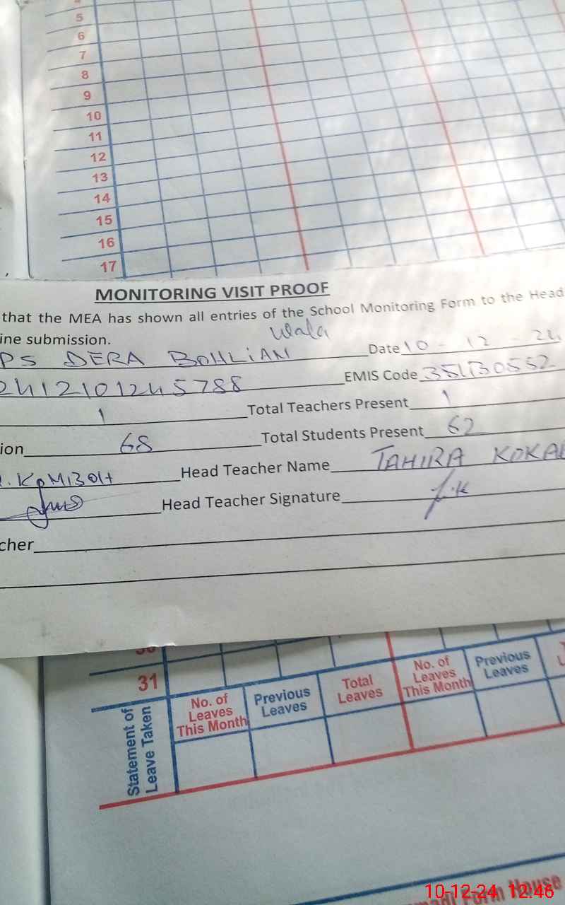 | Attendance Register | Head Teacher | MEA with School | Visit Proof |