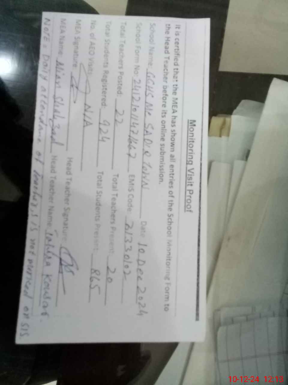 | Attendance Register | Head Teacher | MEA with School | Visit Proof |